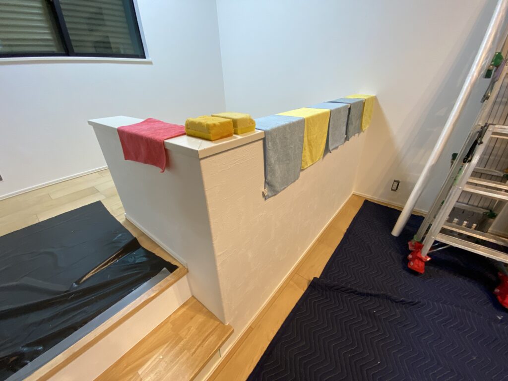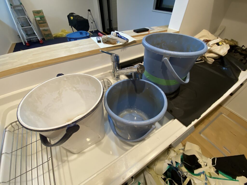 タオルは新しい壁紙を張った時に周りについてしまった糊を拭きとるもの、バケツはそのタオルを濯ぐものとして使います。作業終了時の片付けで必ず行うことが、使っていたタオルを干すこととバケツの水をあけておくことです。