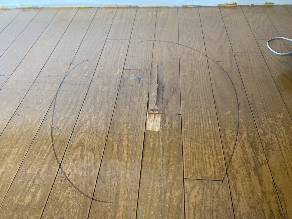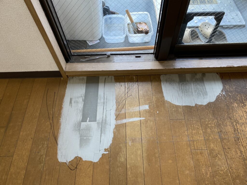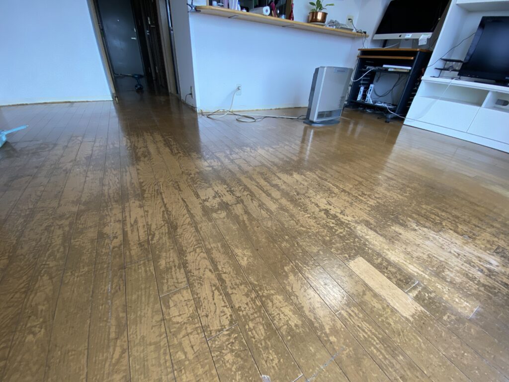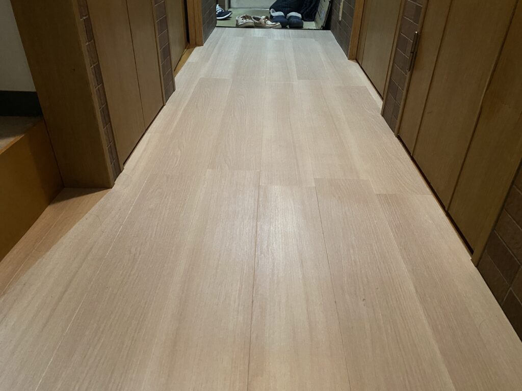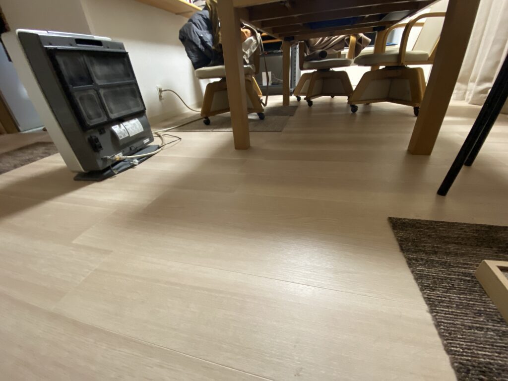 LD約9畳と廊下約3畳の廊下古くなったフローリングの上に床タイル(サンゲツ:WD1009)を張りました。フローリングの表面が剥がれている所は補修して張ります。荷物移動は家の方に手伝っていただきましたので荷物移動費は発生していません。